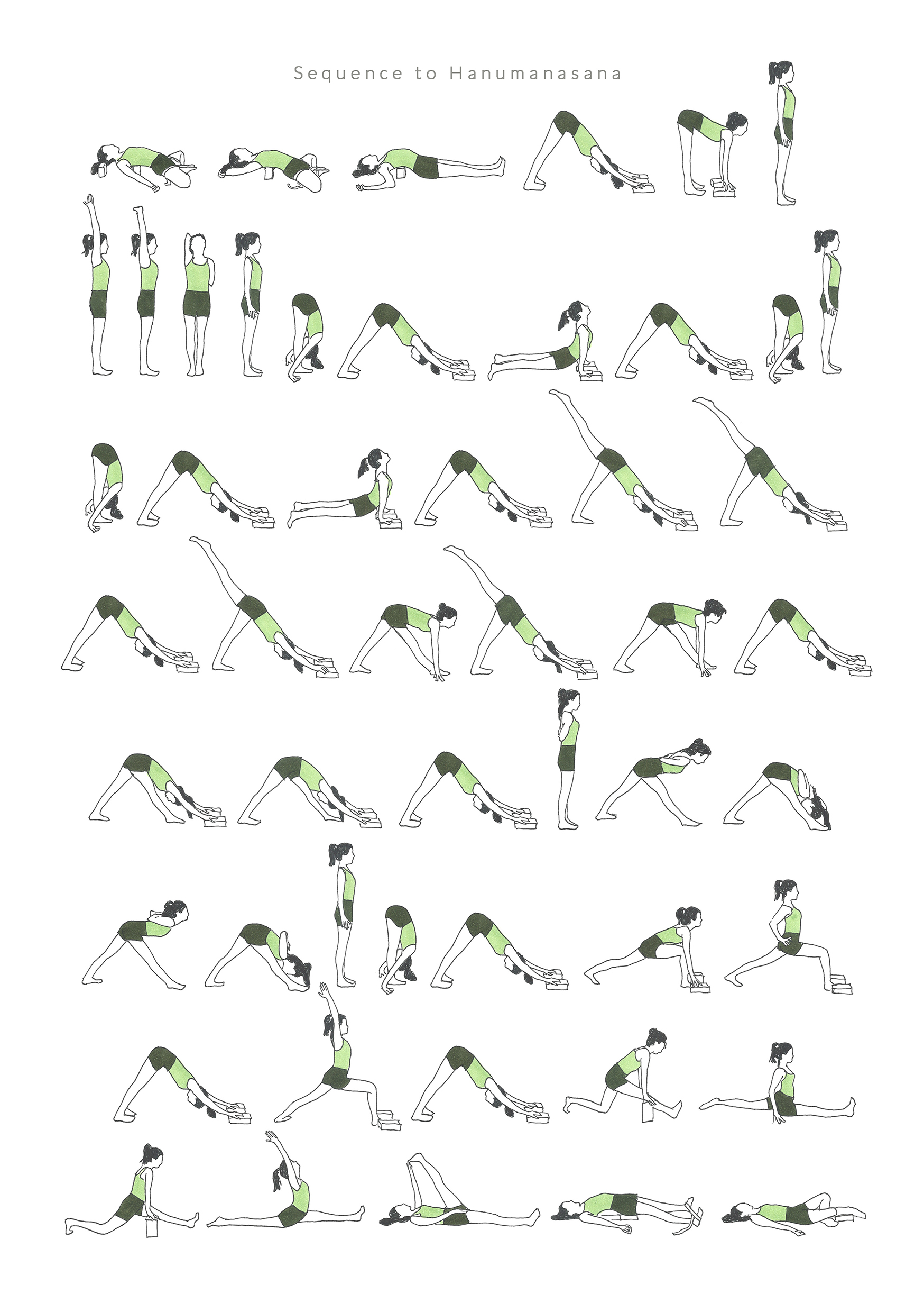 Hanumanasana – from Anjaneyasana with blocks under the hands, slowly straighten the front leg by pushing the heel into the floor and bring the heel forward, the back knee remains on the floor until the sitting bones come to the floor.