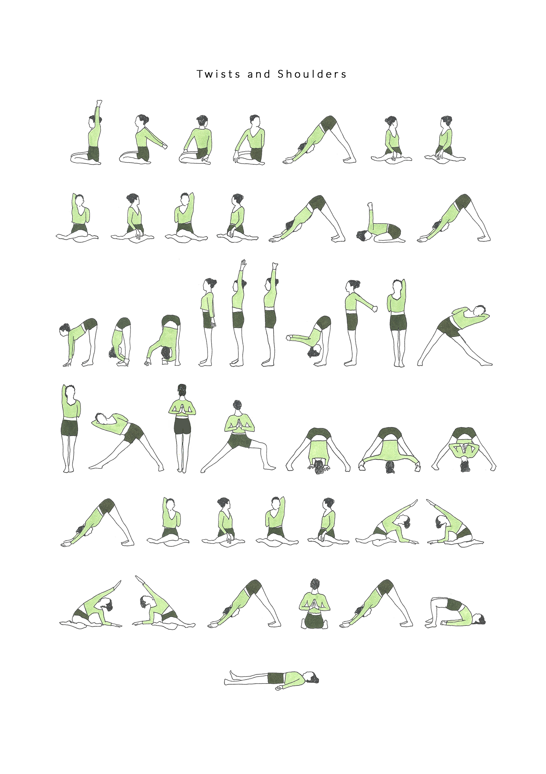 Gomukhasana – only the legs (buttocks on the floor, feet to the edges of the mat) turn to the right, switch legs and turn to the left