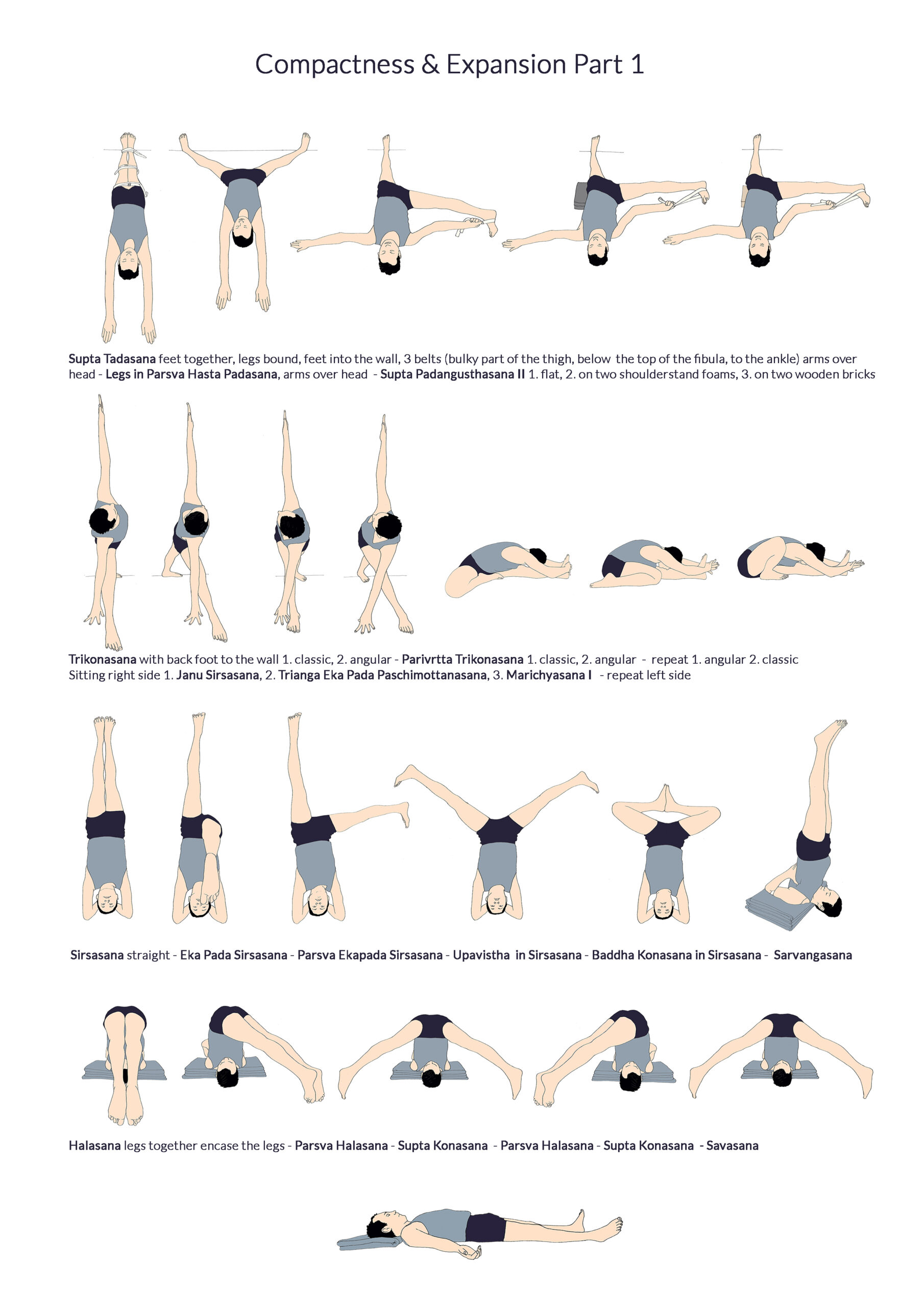 Supta Padangusthasana II – 1. flach, 2. auf zwei Schulterstand Schaumstoffen, 3. auf zwei Holzklötzen